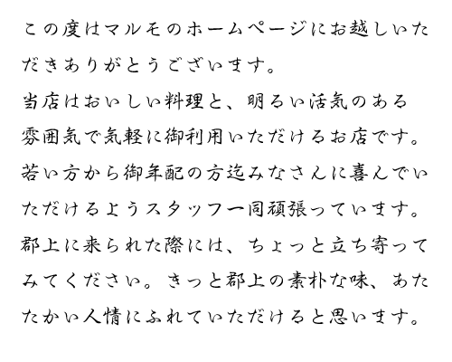 この度はマルモのホームページにお越しいただきありがとうございます。当店ではおいしい料理と明るい活気のある雰囲気で気軽に御利用いただけるお店です。若い方から御年配の方迄みなさんに喜んでいただけるようスタッフ一同頑張っています。郡上に来られた際には、ちょっと立ち寄ってみてください。きっと郡上の素朴な味、あたたかい人情にふれていただけると思います。