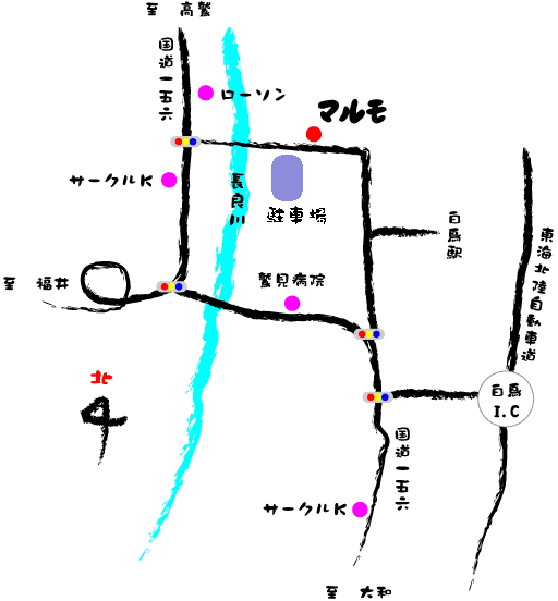 東海北陸自動車道をご利用の際は、白鳥インターを下車、二つ目の信号を右折、2つ信号を直進し、突き当たったら左折して150mほど行ったら右側にあります。